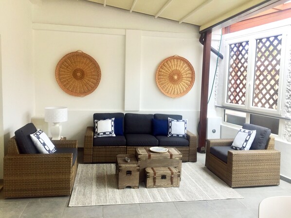 Sowohl das Wohn- / Schlafzimmer als auch der offene Balkon liegen auf der Terrasse. Ein perfekter Ort, um die langen Sommerabende zu genießen. Flachbildfernseher, ausgestattet mit WIFI. . Die gut ausgestattete Küche verfügt über einen vollen Kühlschrank und einen Geschirrspüler.