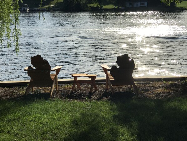 The lakeside of the suite has a patio that overlooks Duncan Lake. The patio contains outdoor eating amenities, as well as comfortable chairs to enjoy the view. We are up on a hill, and there is a beautiful winding stairway that brings you to the lakefront, where we enjoy 120 feet of frontage. It is an absolutely beautiful location on the lake. While sitting on the lakeside deck, you enjoy a western view with gorgeous sunsets and long views of the lake.