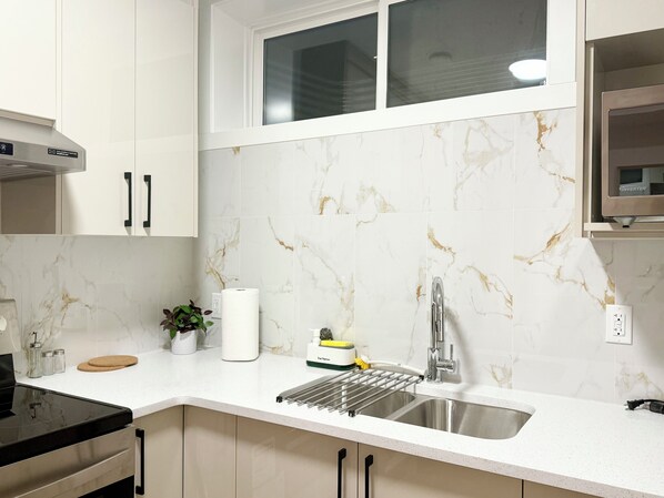 Kitchen • Full-size oven and stove • Microwave and refrigerator • Nespresso coffee machine with coffee and essentials • Cookware, dishes, and basic kitchen supplies included