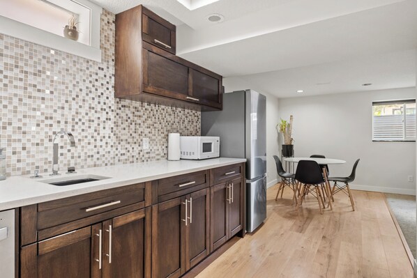 One bedroom basement suite with a shared backyard. Note that we welcome group sizes up to four, however, please note the secondary sleeping option is a futon in the living area. It may not be suitable for all groups. The units are pet friendly so you may meet dogs during your stay.