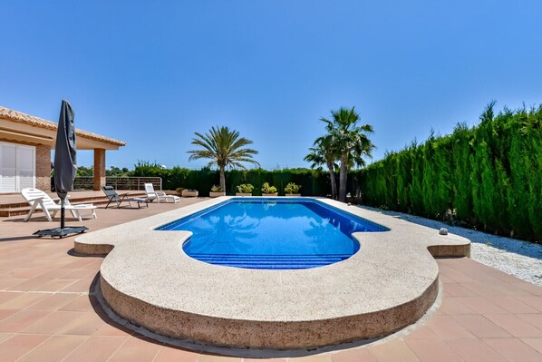 Die 90 m² große Unterkunft befindet sich im unteren Stockwerk einer zweistöckigen Villa (das obere Stockwerk ist geschlossen und wird nicht vermietet) und ist aufgeteilt in ein geräumiges Wohn-Esszimmer, ein Schlafzimmer mit Doppelbett und Deckenventilator, einen vorherigen und unabhängigen Raum mit zwei Einzelbetten für zwei Kinder. Eine offene Küche, ein Badezimmer mit Dusche und ein zweites Schlafzimmer mit Doppelbett und Deckenventilator. Es verfügt über eine Klimaanlage im Wohnzimmer.