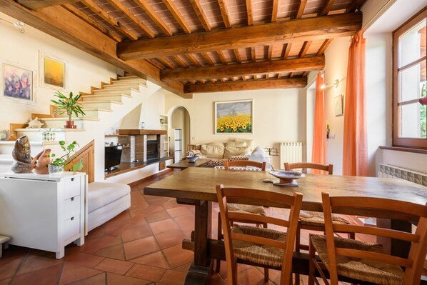 Ground floor: The ground floor consists of a welcoming and bright living area, furnished with: two sofas, tv, fireplace, dining table, and kitchen. The kitchen is fully equipped with: stove, oven, small electric oven, refrigerator, dishwasher, and coffee machine.