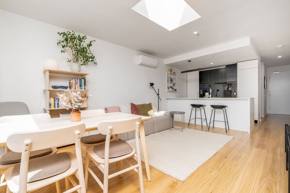 Enjoy full access to the well-equipped kitchen, which includes a fridge/freezer, crockery, cutlery, microwave, cooktop, oven, and dishwasher. We`ve stocked basic breakfast items such as milk, coffee, and tea. For longer stays, guests are responsible for their food purchases.