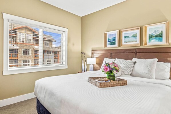 Bedroom 1: w/ King-size bed, electric fireplace, TV, and ensuite 4-pc spa-inspired bathroom, walk-in closet