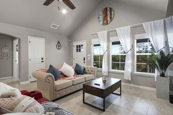 A winding drive down a Texas Hill Country road, a charming cottage sits atop an elevated lot awaiting your arrival. Evening gatherings take place in a warm hot tub or a cozy campfire, perfect for making s'mores. Visit a local winery, cruise on a boat, hike the Canyon Lake Gorge, catch some sun at the “lake beach”, float the Guadalupe River with a beverage of choice or slide down the Schlitterbahn Waterpark tubes. Canyon Lake is truly a fun/elemental place and you'll love it!
