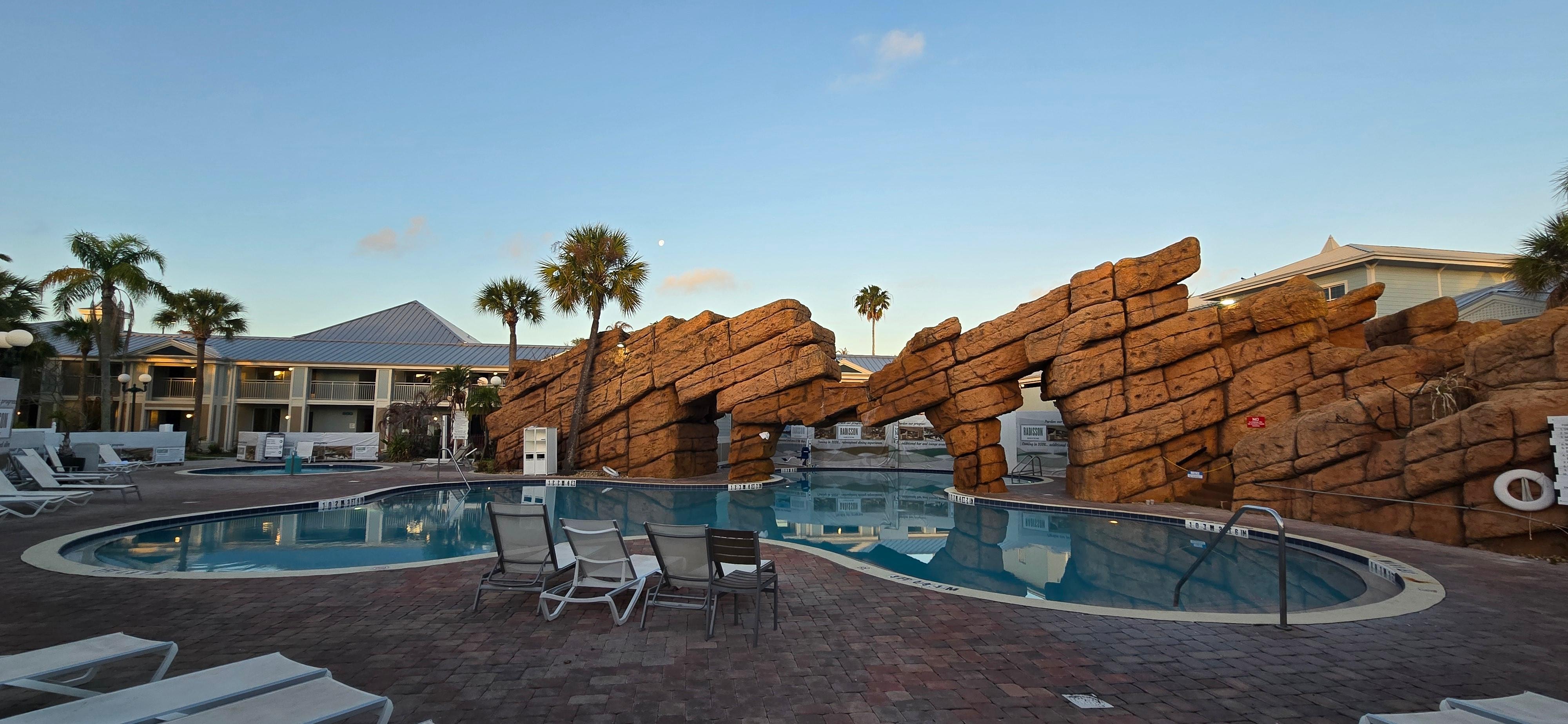 We were only here for 1 night before our cruise but the property was beautiful. We slept most of the time we were here so we didn't get to really experience the pool but it looked nice. Rooms were updated and very clean. My only complaint was they dont have a marketplace inside the hotel for drinks or snacks. So I had to walk to the next hotel over that they owned to get a soda. Overall it was a very nice place to stay and the beds were comfortable. I would stay here again.