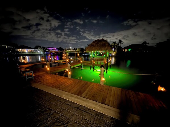 • Fish directly from the dock - Fishing poles and tackle box in the garage - underwater fish light that attracts fish • Weber gas grill (extra propane provided) • Outdoor dining for 6 • Adirondack seating • Wall-mounted Smart TV on lanai + 2 ceiling fans • Pool toys, pool basketball & life-size Connect Four • Lighted pathway to front entrance and stairs are lighted going down to dock area