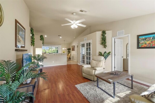 Für diejenigen, die arbeiten müssen, bietet das Haus ein schönes Büro mit französischen Türen und direktem Zugang zum zweiten Badezimmer. Die voll ausgestattete Küche bietet alles, um ein wunderbares Abendessen zuzubereiten. Für eine einzelne Tasse Kaffee können Sie die Keurig-Maschine verwenden. Wenn Sie Gesellschaft haben, können Sie einfach die normale Kaffeemaschine verwenden. Der Küchentisch bietet Platz für die ganze Familie. Im Wohnzimmer finden Sie einen modernen Flachbildfernseher mit einem Laptop, mit dem Sie Ihre bevorzugten Kanäle streamen können. Genießen Sie das Leben im Freien am beheizten Salzwasserpool, der das ganze Jahr über zum Schwimmen einlädt. Ob Sie ein paar Runden schwimmen oder einfach nur die Sonne auf einer der vier Liegen genießen möchten, Villa Pine Island bietet Ihnen beides. Wenn Sie am Pool frühstücken und den Sonnenaufgang genießen, ist das ein Genuss für die ganze Familie.