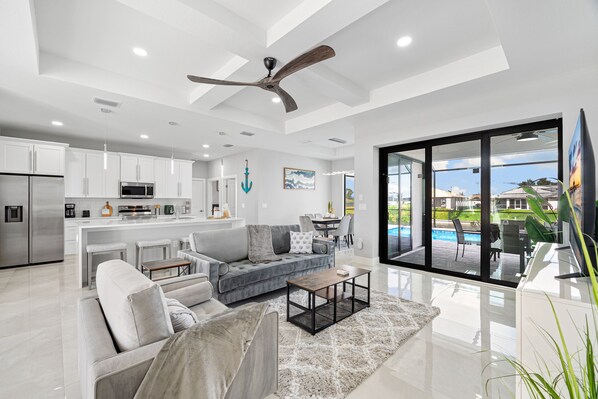 Der offene und moderne Wohnbereich ist mit einem Essbereichen, einem gemütlichen Sofa und einem Smart TV ausgestattet. Der Tisch im Essbereich lässt sich von sechs auf acht Plätze erweitern. Wifi ist im gesamten Haus verfügbar.