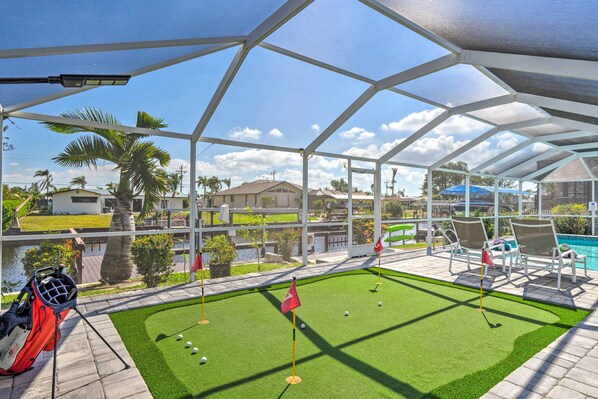 OUTDOOR LIVING: Large screened lanai, private heated saltwater pool, putting green w/ mini-golf, pool toys, covered patio, prep space, outdoor dining area, lounge chairs & beach towels, shaded canal-front patio w/ outdoor seating, updated boat dock w/ clear window & green light, 2 kayaks, life vests, gas grill, 2 bicycles
