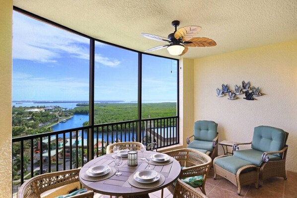 Step onto your screened lanai, accessible from both the living room and master suite, and take in panoramic views stretching southward towards the Gulf, Fort Myers Beach, the Caloosahatchee River, and Sanibel Island—the perfect backdrop for your morning coffee. A second private lanai off the guest bedrooms ensures every guest enjoys their own slice of paradise.