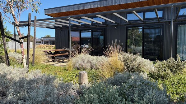This new and modern property is located in beautiful Cape Paterson, in the award-winning eco village, The Cape. This holiday home is only a short 1.4km walk to the beach along the village paths. This well-insulated property features a fully equipped kitchen with electric cooking, a microwave, dishwasher, breakfast bench with seating and refrigerator, and high quality kitchen utensils.