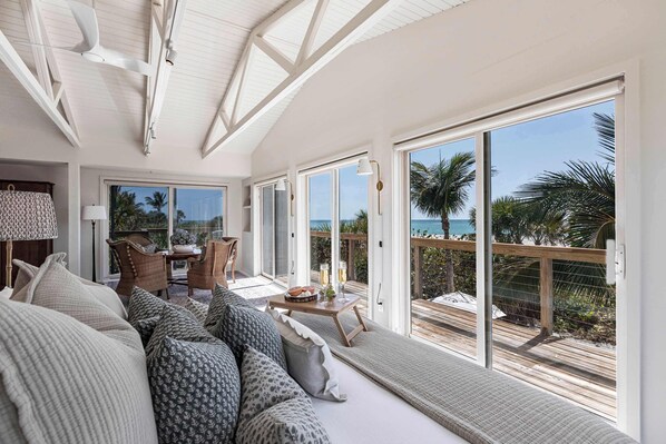 -Expansive windows and sliding doors fill the space with natural light and panoramic Gulf views