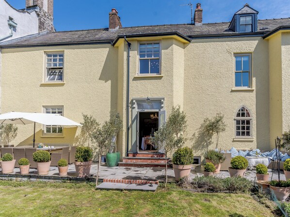 Bedroom 5: 2 x Single (3ft) Beds Ensuite: Bath, Heated Towel Rail, Toilet. Oil central heating, electricity, bed linen, towels, Wi-Fi and logs for wood burner included. Travel cot, highchair and stairgate available on request. Welcome pack. Enclosed garden with terrace, garden furniture and barbecue. Private parking for 5 cars. No smoking. Please note: There are 20 steps in the garden to the parking at the rear.. The Old Vicarage is nestled peacefully within the township of Laugharne. This magnificent Grade II listed Georgian house has been sympathetically restored, enabling the property to retain all of its original attractive features including stone walls, slate and original tiled flooring im some rooms, high ceilings. Welcoming touches have been added such as a wood burner and new Oak flooring to provide a wonderful ambience for cosy nights in.