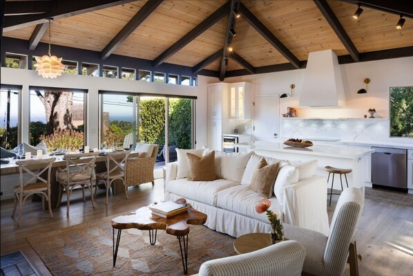 Cook’s kitchen with top-of-the-line appliances, Wolf oven, center island with bar stools & ocean view, wine fridge, washer/dryer, generous sized bedrooms with abundant natural light, lovely ocean views or scenic nature views from every window in the house and covered parking in garage.