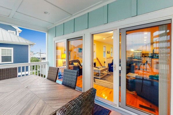 An eclectic mix of family room furniture is meant to provide something different for each of our guests Variety is EVERYTHING! Also on this floor, you’ll find a remote work cubby (*use sparingly*), large screen TV, and another private deck space providing both interior AND exterior dining options to suit the weather, mood, or ambience.