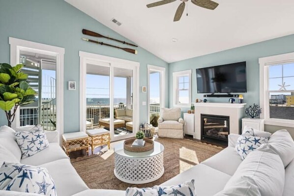 On the top floor an expansive, open floor plan unfolds – a seamless integration of kitchen, half bath, living, and dining areas, strategically positioned to capture mesmerizing ocean vistas throughout the day. Seven decks, including a crow's nest offering a panoramic 360-degree view of the ocean and canal, invite you to enjoy your morning coffees or evening cocktails. Our home is especially well appointed as the end unit closest to the boardwalk with a beautiful view of both the ocean and boardwalk.