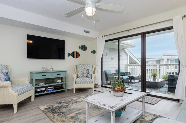When you get to "A Little Piece of Heaven", you will first step onto the outdoor deck and go through the slider to enter the interior of the unit. Inside you will find yourself in the living/dining and kitchen area. The kitchen has everything needed for a meal together including the ease of an air fryer, a cute dining table is ready for service, and the sofa converts into a sleeper for the kiddos or extra guests. There is a full bathroom with a shower/tub combo. The bedroom has a Queen bed and private balcony where you will find the laundry closet. Want to save a bit of space traveling? Don't worry! There is also beach chairs and a wagon provided to make your beach days a breeze!