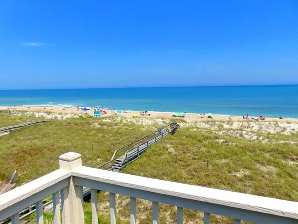 Enjoy sweeping panoramic views from the living room, master bedroom and deck of this top 3rd floor corner Condo directly on the ocean. Swim, catch waves, or build sandcastles below your bedroom or dine on your deck overlooking the ocean. Master Bedroom has Queen bed with private bathroom and opens onto deck; second bedroom has Twin Beds with small ocean view and bathroom.