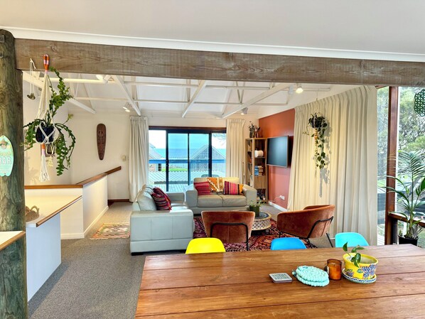 UPSTAIRS Large open plan lounge and dining A fully equipped kitchen with dishwasher, microwave, oven, gas cooktop, fridge and coffee machine An island bench with breakfast bar is the centrepiece of the family living Two bedrooms which have expansive windows and enjoy direct views to the sea and rolling rural hills Large main bathroom with spa bath and laundry with washing machine Two large entertaining decks with shade sails, expansive views and a gas barbecue Flat screen TV