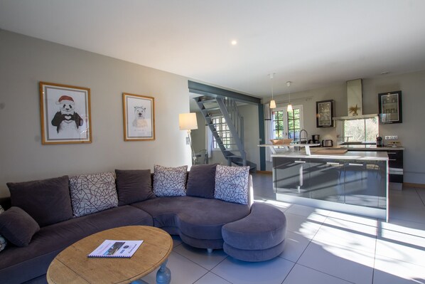 Eine zum Wohnzimmer und Esszimmer offene Küche (Induktionsherd, Dunstabzugshaube, Backofen, Mikrowelle, Geschirrspüler).