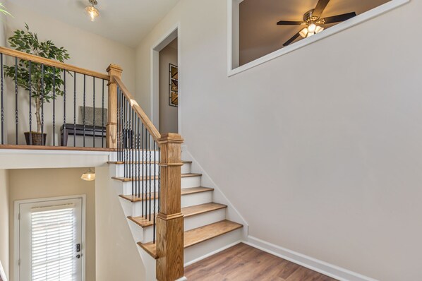🛏️ 2 upstairs guest suites – Queen beds, private bath access, Smart TVs & hotel-quality linens
