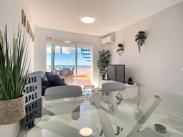 Die sonnige Terrasse ermöglicht es Ihnen, den ganzen Tag über die Sonne zu genießen und einen 360°-Blick auf das Meer, die Berge und den Golfplatz zu haben.