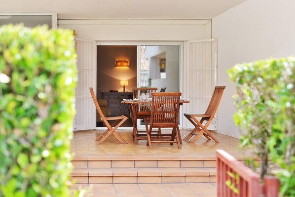 🛋️ Spacious and bright living room, with direct access to a lovely furnished outdoor terrace — perfect for peaceful breakfasts or dinners under the stars.