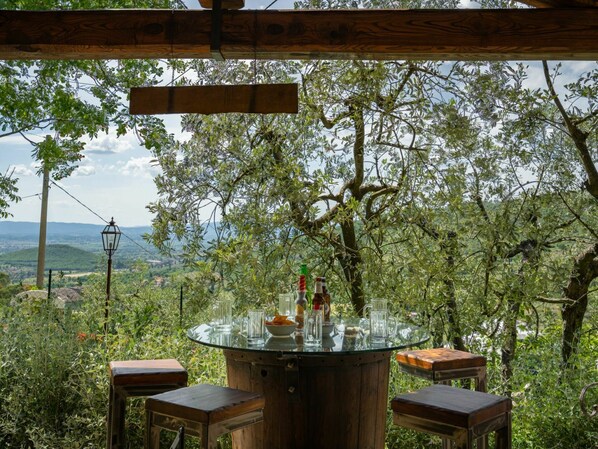 Haus "La Felcaia", 600 m.ü.M.. 2.5 km vom Zentrum von Castiglion Fiorentino, 10 km vom Zentrum von Cortona, 35 km vom See, im Grünen. Zur Mitbenutzung: Grundstück 3 ha, terrassierter Garten (nicht eingezäunt) mit Bäumen. Tischtennis, Pergola (50 m2), Gartenmöbel. Zur Alleinbenutzung: Grundstück 500 m2, terrassierter Garten (eingezäunt) Bäumen, Schwimmbad (11 x 5 m, 90 - 190 cm tief, saisonale Verfügbarkeit: 01.Mai. - 06.Okt.). WC im Poolbereich, Aussendusche, Tischtennis. Im Hause: Tischfussball, Alarmanlage. Parkplatz (für 2 Autos, überdacht) auf dem Grundstück. Einkaufsgeschäft 2.5 km, Supermarkt 3.5 km, Bushaltestelle 500 m, Bahnstation "Castiglion Fiorentino" 3.5 km, Sandstrand "Castiglione della Pescaia" 160 km, Badesee "Lago Trasimeno" 35 km. Golfplatz (9 Loch) 13 km, Wanderwege ab Haus 50 m. Nahe gelegene Sehenswürdigkeiten: Arezzo 25 km, Firenze 100 km, Valdichiana Outlet Village 20 km. Bitte beachten: Fahrzeug empfohlen. Der Besitzer wohnt auf dem gleichen Grundstück.