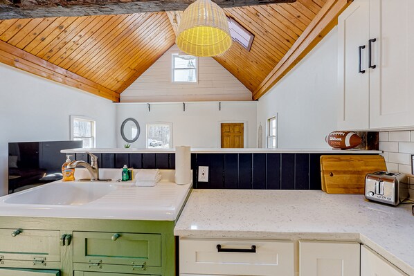 Nestled in the charming village of Cavendish, Vermont, this cozy, dog-friendly cottage is the perfect retreat for families and outdoor enthusiasts alike. With one bedroom, two bathrooms, and a sleeping loft that accommodates two double beds and a double sofa bed, this home comfortably sleeps up to eight guests. The thoughtfully updated kitchen, complete with modern appliances (excluding a dishwasher), invites you to whip up delicious meals after a day of adventure.