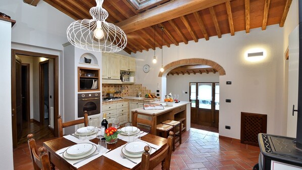 Die gemütliche, geschützte Terrasse, die sich an der Vorderseite des Hauses befindet, dürfte ein willkommener Entspannungsort sein. Im Innenbereich befinden sich zwei große Schlafzimmer, jeweils mit angrenzendem Badezimmer, und ein zusätzliches Einzelzimmer für ein Kind. Die komplett ausgestattete Küche, die auch einen Esstisch beinhaltet, ist das Herzstück des Hauses und es gibt außerdem einen Wohnbereich. Die schlichte, moderne Einrichtung bildet einen gelungenen Kontrast zu den traditionellen toskanischen Elementen wie den Kachel- und Balkendecken und den Terrakottaböden. Es ist ein gemütliches und gut ausgestattetes Ferienhaus.