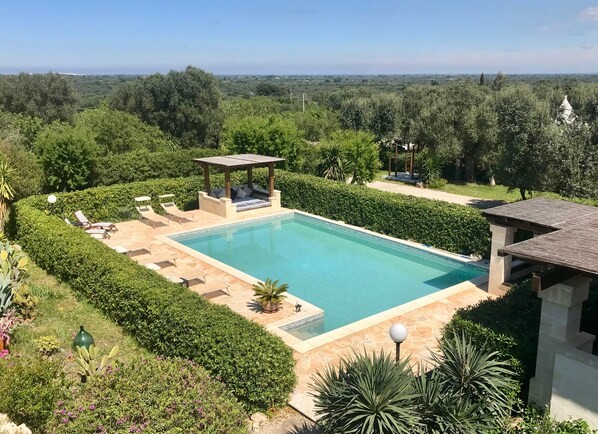 Draußen die schwer zu beatenden Annehmlichkeiten gehören ein großes gefliestes Schwimmbad, seichtes Relax / Planschbecken, Dachgarten, versunkene marokkanischen Stil Dachterrasse mit Futons und stimmungsvolle Beleuchtung, große überdachte Pool-Terrasse für das Leben im Freien mit einer eigenen Lounge, Esstisch, Bar und Kochen auf einem BBQ oder großen Gas-Ring mit riesigen Pfannen für Paella, Risotto oder Pasta und außen Kühlschrank. Diese Terrasse verfügt über dimmbare Kronleuchter, um an warmen Sommernächten die richtige Atmosphäre zu schaffen. Auf der Trullo-Terrasse gibt es einen Holzofen, einen Grill, eine Feuerstelle und einen großen Esstisch. Die Villa Courtyard verfügt über einen weiteren Grill- und Esstisch.