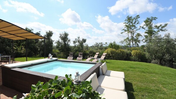 Vor dem Haus befindet sich eine sonnige Terrasse, die durch eine Pergola schattige Sitzgelegenheiten für vier Personen und einen Grillplatz im Freien bietet. Der Whirlpool ist von einem eleganten Sitzbereich umgeben. Hier können Sie sich auf einer Sonnenliege am Pool und mit einem Aperitivo entspannen und so in das toskanische Leben eintauchen.