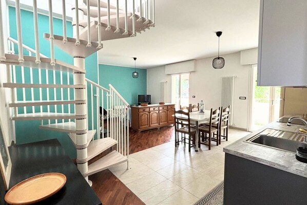 Description: charming penthouse on two levels with new furnishings on the second floor of a small building near the sea.