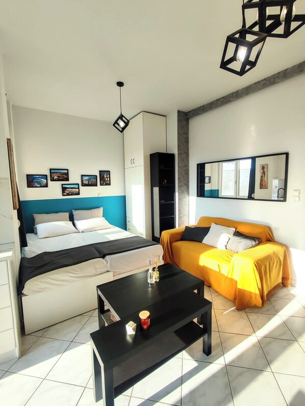 The Blue Horizon studio captures the best colors of the palette for the island home. It is bright and painted in the color of ice, with natural wood touches and with modern touches that blend harmoniously with each other. This is a beautiful and quiet 3rd floor apartment in a safe and historic neighborhood. Our apartment is fully equipped and furnished with modern décor and a balcony with a view.