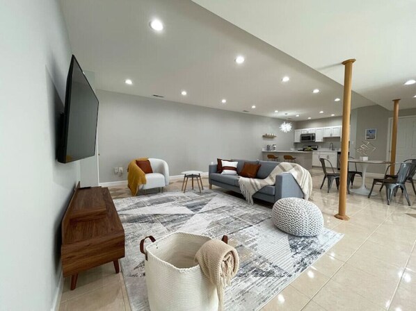 Sleep comfortably in queen-size overstuffed mattresses inside the 2 bedrooms. Enjoy complete amenities including a full kitchen, ultra high-speed Internet from Verizon Fios, business workstation, 2 large screen Smart 4k TVs with wi-fi ready apps, Netflix, HBO, Amazon Prime and Disney+.