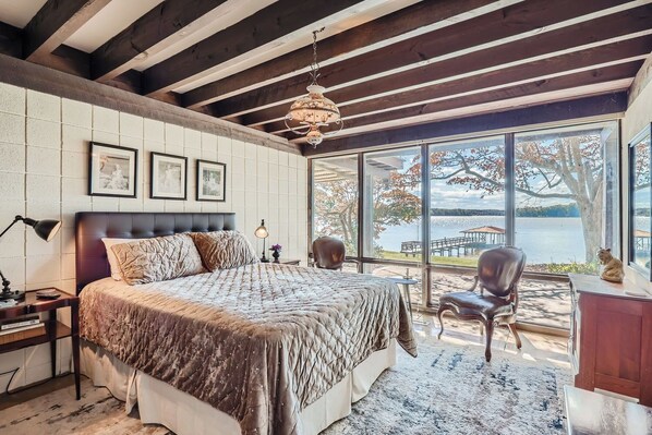 Classic charm meets modern-day convenience in this 4-bedroom waterfront home! Experience luxury and history on the banks of Lake Norman. Guests are irresistibly drawn to this beautifully designed and lovingly restored mid-century modern gem. One of the first private residences built on Lake Norman, the home offers incredible waterfront vistas 365 days of the year. Enjoy the exposed beams, architectural details, and well-appointed interior. Take in the fantastic main-channel views through exterior glass walls. Ample seating and comfort on both levels featuring new big-screen TVs and Wi-Fi for relaxing after a day on the lake or just enjoying the peace and quiet of the large wrap-around deck. Bring your boat or ask about special discounts on watercraft rentals from local marinas. The home will comfortably accommodate up to 6 adults. Kids have their own space with 4 provided bunk beds in a dedicated bedroom.
