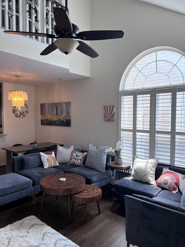 This space has it all. Upon entering you’ll find spacious rooms with cozy seating and a large, fully stocked kitchen for those who want to cook at home. The master bedroom invites you in with a king bed and brilliant master bath. Upstairs you’ll find two more bedrooms. One with another comfy king bed and the 3rd bedroom is equip with bunk beds. 2 twin beds on the bottom and full on top. There is also a dedicated work space with a built in desk should you need bring work along with you.