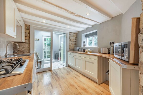 Sunny aspect and well equipped, amenities include an electric oven, gas hob, slimline dishwasher, washer/dryer, microwave, kettle, Nespresso coffee machine and toaster