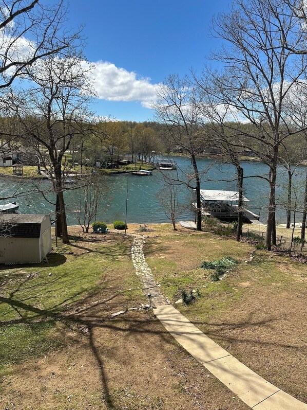 Summary: Relax with the whole family at this peaceful lake front home. Three bedrooms, two baths and two living areas can accommodate multiple families. A sleeper sofa in the lower living area can accommodate additional guests and has a lake view and access. This getaway offers clean modern style and comfort. Great views and access to the lake in the back yard. A short walk or drive to shopping, dining or boat rental.