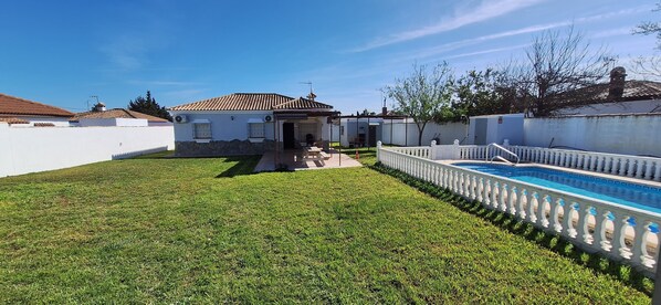 Im Außenbereich erwarten Sie ein privater, umzäunter Pool, Garten, offene Terrasse, überdachte Terrasse und Grill – perfekt für entspannte Stunden im Freien. In der Nähe empfehlen sich der Strand La Barrosa, der Naturpark Bahía de Cádiz, der Beach Club Atenas Playa, das Restaurant Popeye und La Castillería.