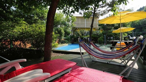 Der saisonal geöffnete Pool ist von Juli bis August geöffnet