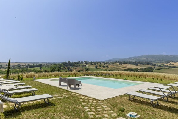Das Anwesen ist von einer großen Rasenfläche umgeben und verfügt über einen herrlichen, mit Salz gereinigten Pool mit zwei Tiefen und einen bequemen Strand, der mit Liegestühlen und Sofas zum Entspannen ausgestattet ist.
