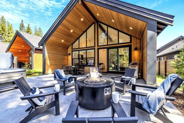 Nestled in The Cabins at the Farm, this modern mountain retreat offers stunning Cascade Mountain views and endless adventures. The Detached Studio features vaulted ceilings, a kitchenette, queen + twin bunk, full bath, and year-round comfort. A lower-level Game Room with shuffleboard and foosball adds to the fun. Unwind on the patio with meadow views, a gas grill, fire pit, and private hot tub—perfect for sunsets and stargazing. Surrounded by nature and resort amenities, this home is your ultimate Pacific Northwest escape!