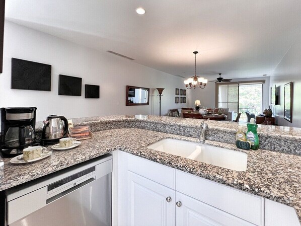 The condo opens to a large, well-equipped kitchen with full-size appliances and breakfast bar seating for 3.  You can also serve up a meal in the dining area, with seating for 4.  The dining space flows into the large living area with a flat-screen TV and access to the large covered terrace.  The outdoor space has a dining table for 4 with chairs that double as a lounge space.  Enjoy relaxing in the shade or evening games night.  Surrounded by large palm trees, the terrace feels like a private haven with the cool ocean breeze giving respite from the tropical sun.