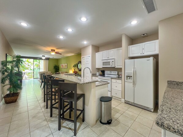 The large kitchen, complete with a breakfast bar that seats four, is perfect for preparing meals and enjoying casual dining. The open-concept living area features a cozy couch and loveseat, and a 50" Smart TV with digital cable, creating a perfect spot for unwinding after a day of adventures. The covered terrace, with a dining table for four, provides a serene space for al fresco meals, with the added benefit of privacy and partial pool views.