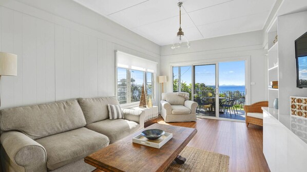 Der Eintritt in die untere Ebene dieses funky renovierten Hauses ist der zweite Wohnbereich. Hier können Sie sich entspannen und eine Tasse Tee mit unglaublichem Meerblick trinken. Yoga-Matten werden mitgeliefert, damit Sie sich optimal entspannen können!