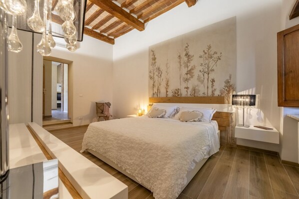 Mit Holzböden und freiliegenden Balken bietet jeder Raum eine gemütliche Atmosphäre, in der Tradition auf modernen Komfort trifft. Draußen gibt es eine offene Terrasse und einen privaten Garten, perfekt, um bei Sonnenuntergang mit einem Glas Chianti oder Brunello die frische Landluft zu genießen.