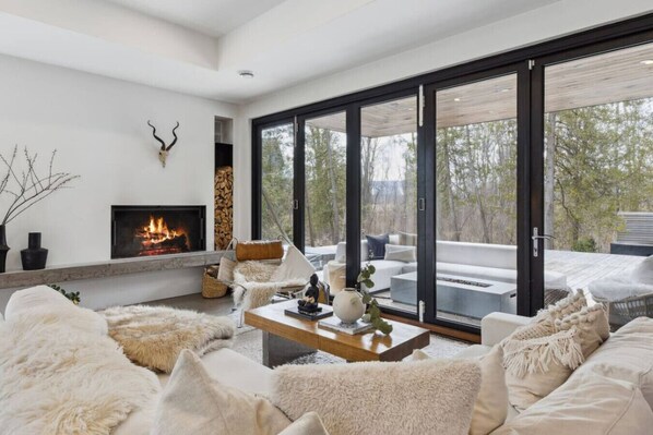 From our chef’s kitchen, your gaze drifts to the living room - the soft curve of the sofa, the gentle crackle of the wood-burning fireplace, and floor-to-ceiling windows that frame the secluded forest like art.