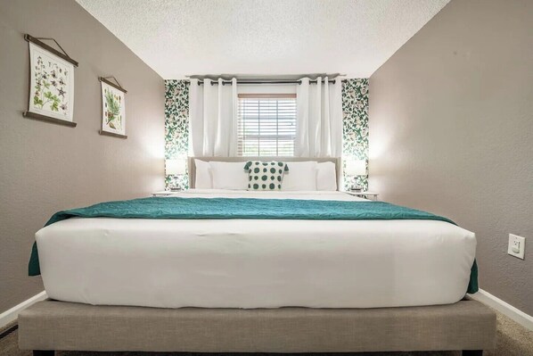 KING SIZE BEDS in all three bedrooms, so no one has to compromise on space and comfort. We provide high quality bedding, plenty of pillows in varying firmness, and fresh linens for your comfort. There are room darkening blinds for sleeping in while on vacation. Each room has a closet with hangers along with luggage racks and/or dressers to hold your belongings. Two bedrooms have window AC units in the summer months.